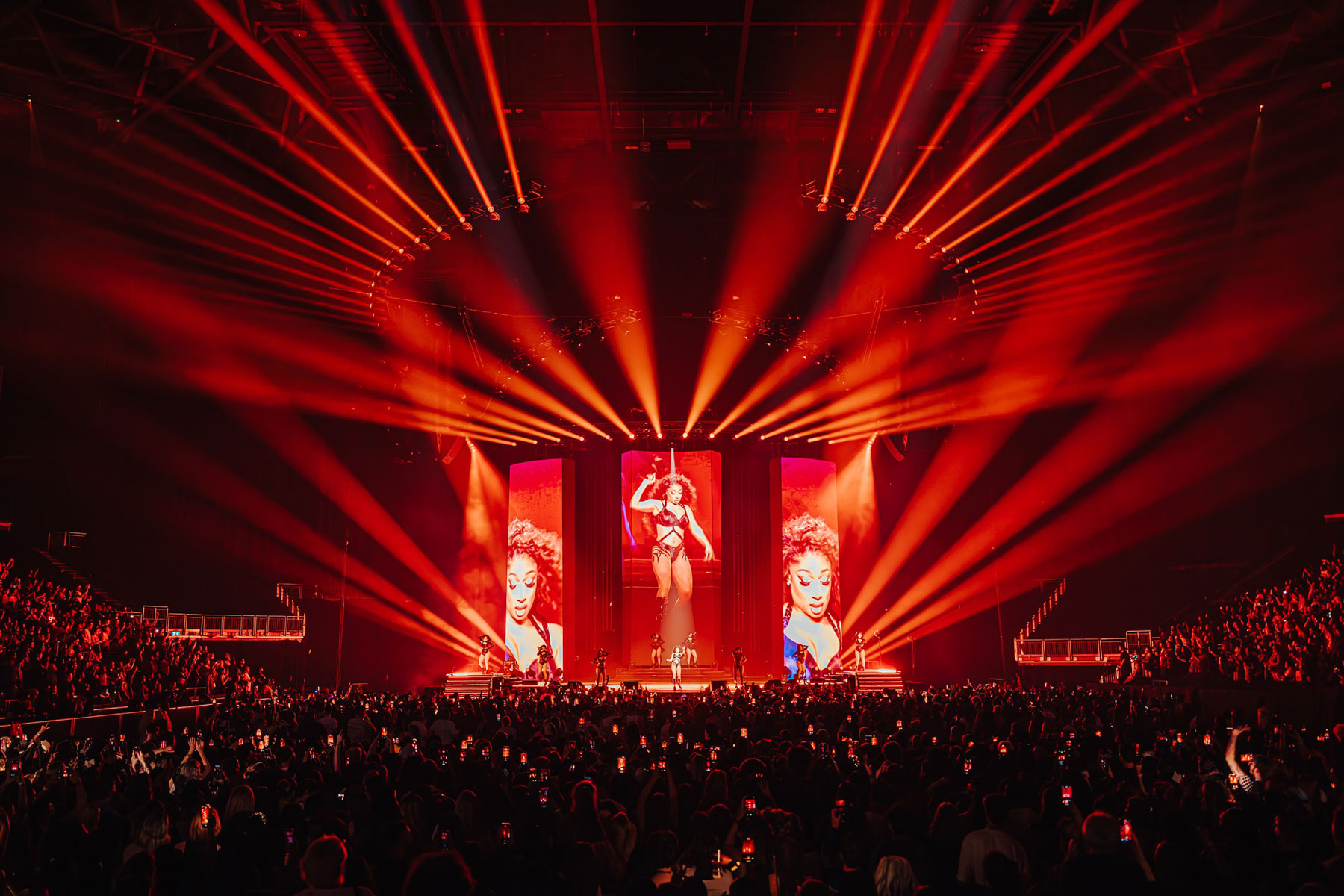 The lighting design featured 92 Elation Artiste Monet profile moving heads, alongside six Proteus Brutus wash FX fixtures, creating a dynamic and immersive environment for Megan’s powerful stage presence and accompanying dancers.