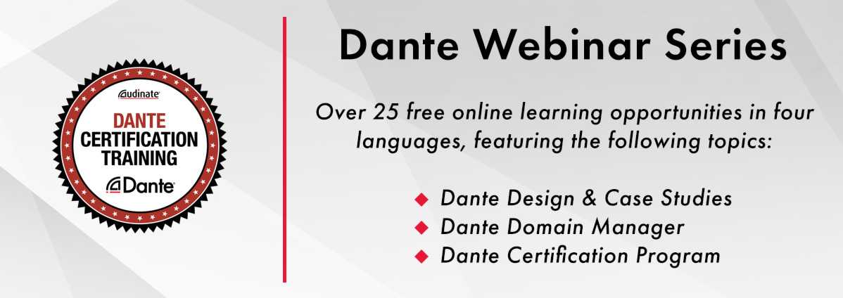 Dante Domain Manager – These courses are ideal for Dante system designers, as well as those interested in being users or resellers of Dante Domain Manager. Participants should possess Dante Level 2 Certification (Level 3 preferred) or have a background in networking.