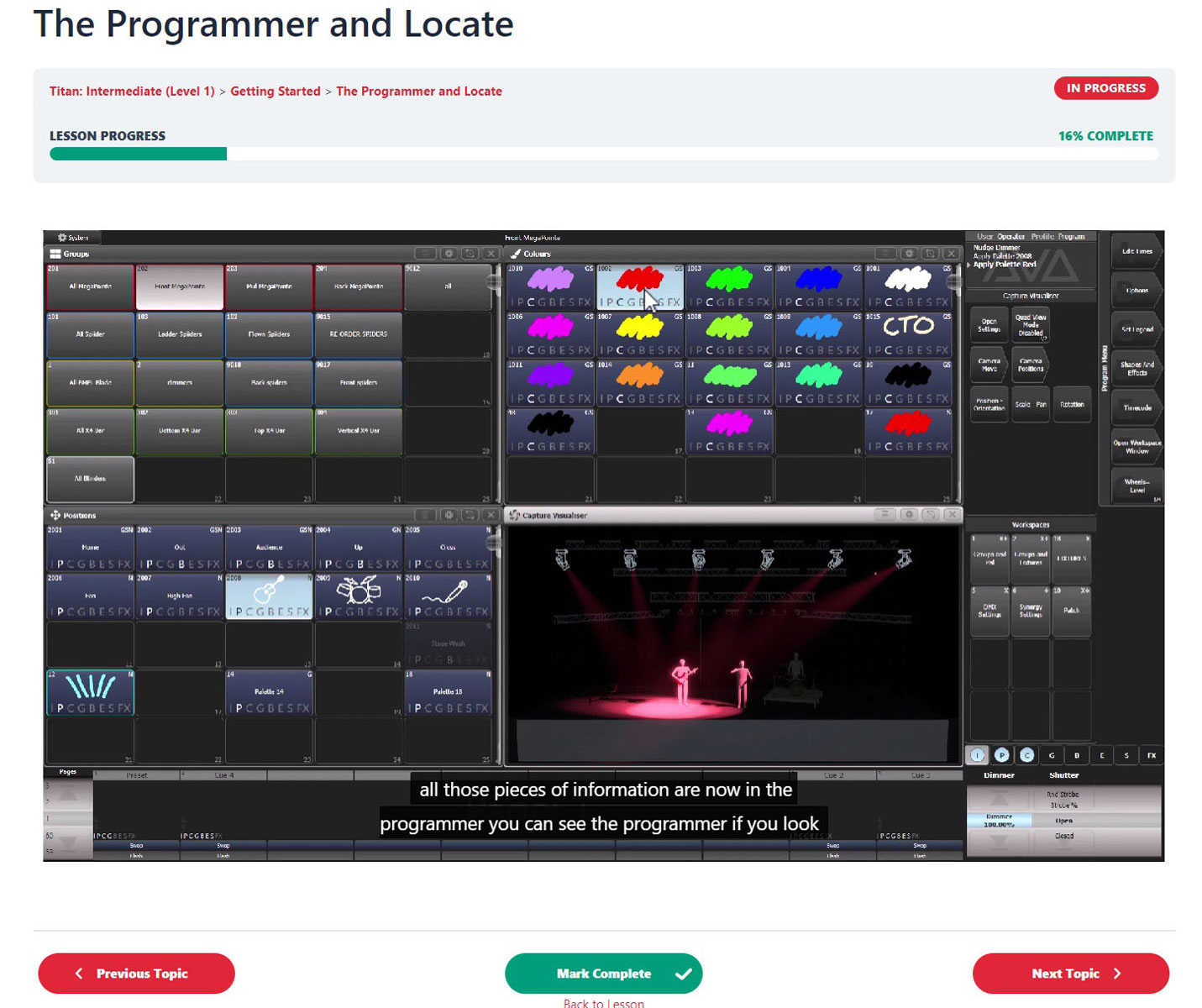 After completing each video and lesson, there is a ‘mark complete’ button to click when everything has been watched and the person is happy to move on. When all the video lessons are finished, users receive a completed Avolites Academy Titan Level 1 Course certificate via email.