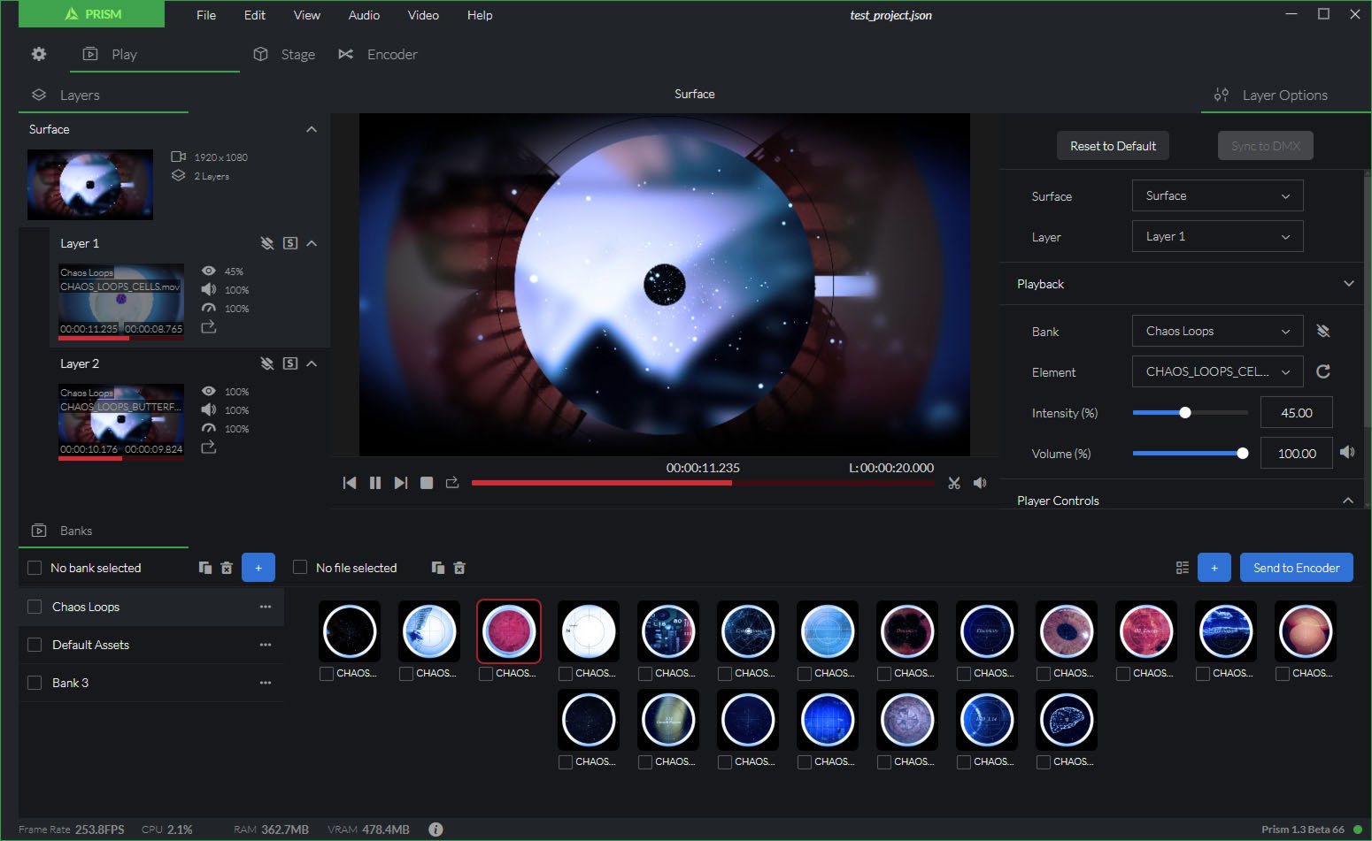 Prism also allows for input sources to be added including NDI input and Live input – e.g. USB capture / webcams allowing you to bring other visual sources such as guest VJs or presentation data into the show. Virtual returns add the ability to take any layer from the mix and use it elsewhere within your project allowing for further creative possibilities. These can all be set up via the Input Settings page and adjusted via the Preview window.