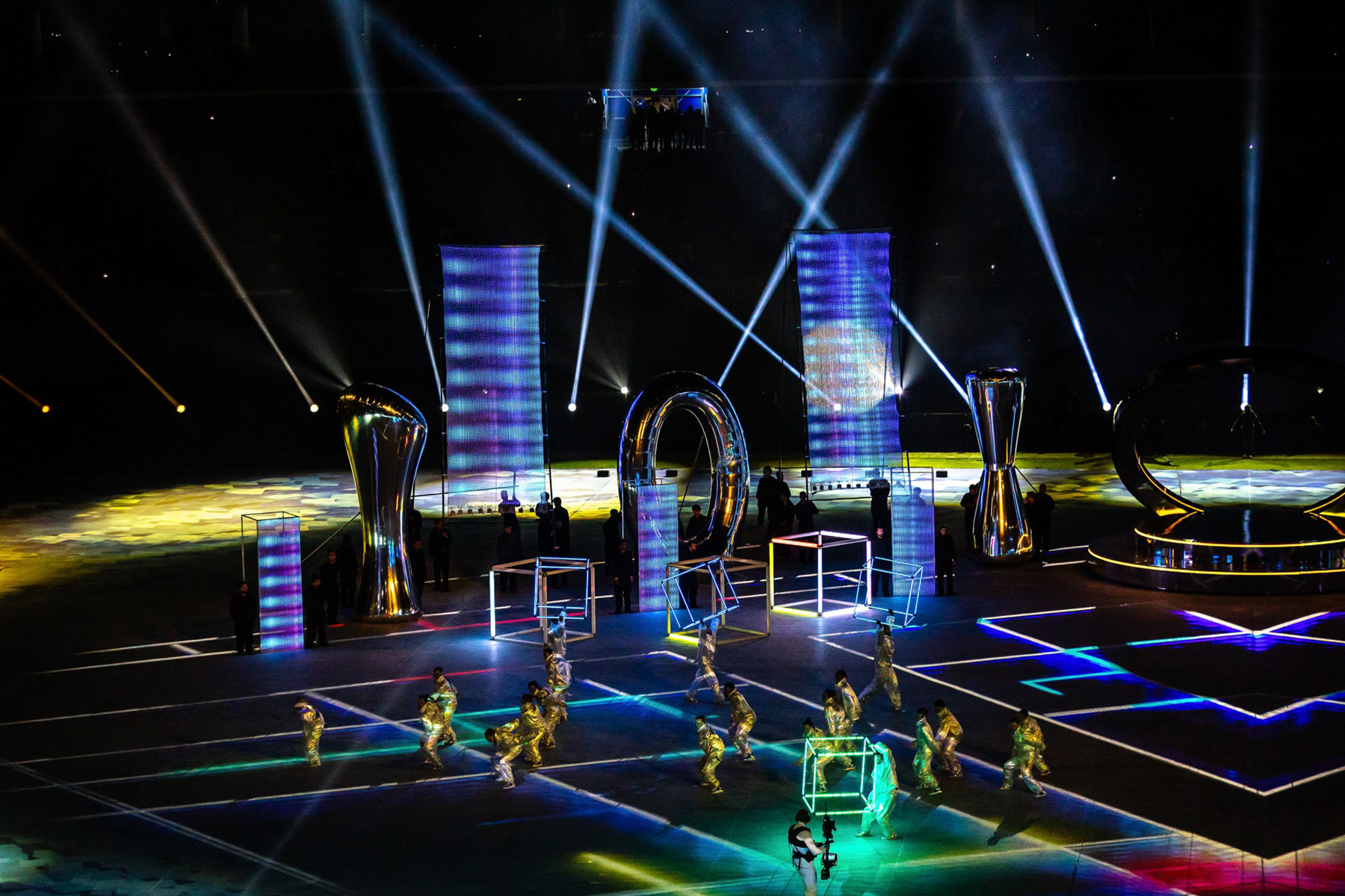 Greil’s lighting design not only had to work for the on-site audience at Jaber International Stadium, but it also had to work for the at-home audience as the ceremony was fully broadcast. The lighting also competed with full-on floor projection, drones in the air, and an elaborate fireworks display, other reasons why firepower was so important.