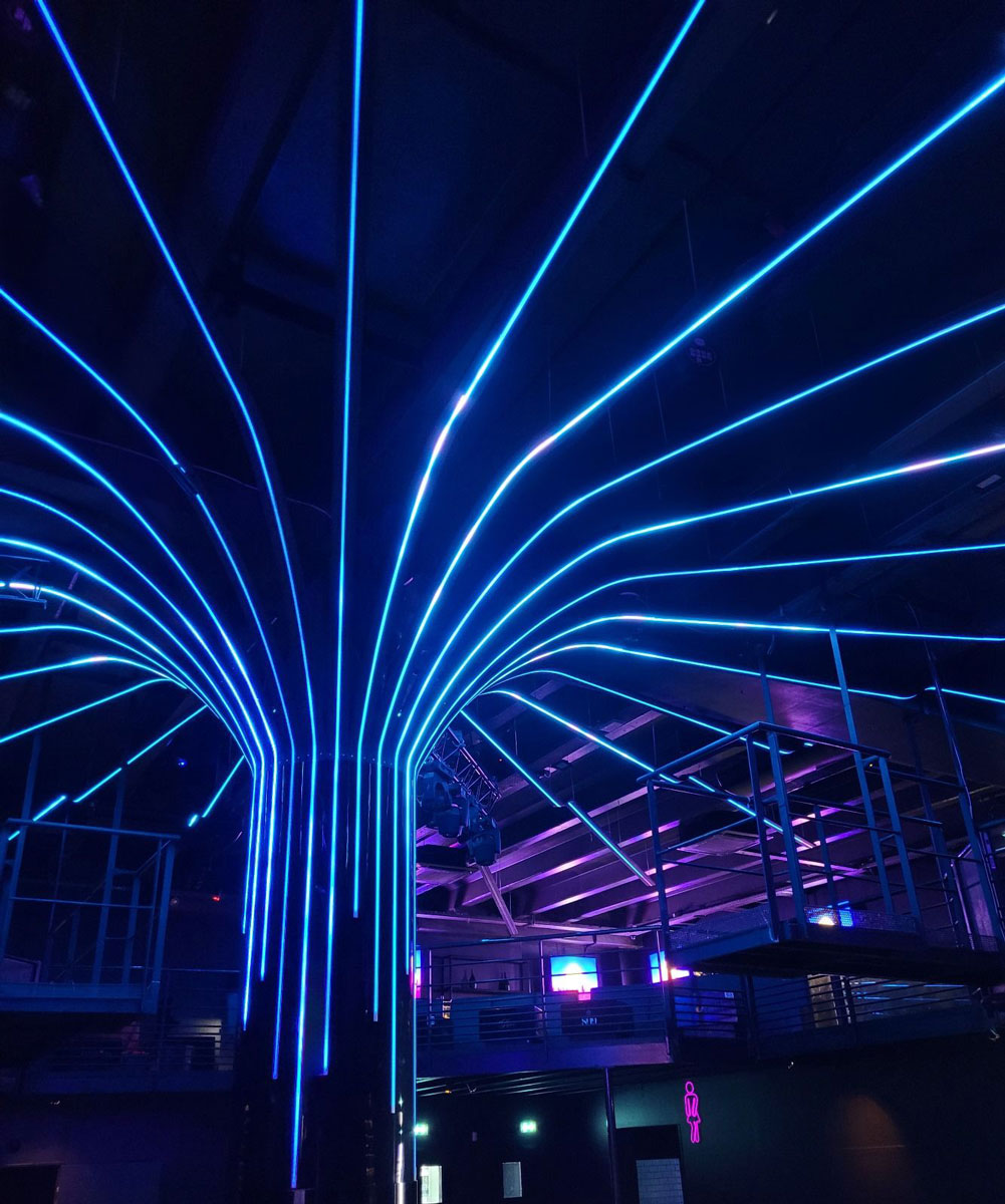 Measuring 5.6m high and pixel mapped with Resolume, this tree is located in the 809 Social Club, a spot for tourists and locals alike in the heart of downtown La Garde. It sprouts from the centre and extends on to the ceiling and on the wall in irregular patterns.