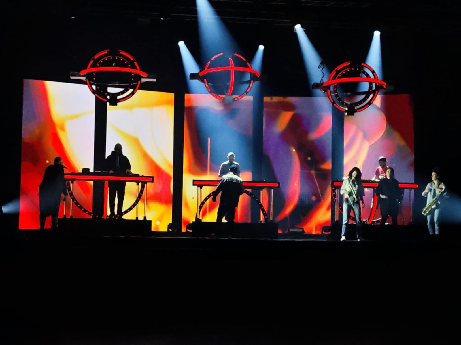 "This very ambitious proposal immediately seduced the artists when we proposed it to them," continued Drichos. "We can even see pieces of gyroscope on the cover of the album. So, we launched the production of three gyroscopes of 2.5m wingspan. Two of the rings are motorized by gyroscope with infinite rotation and matrix LED cladding. Each gyroscope above each musician is motorised by nine winches."