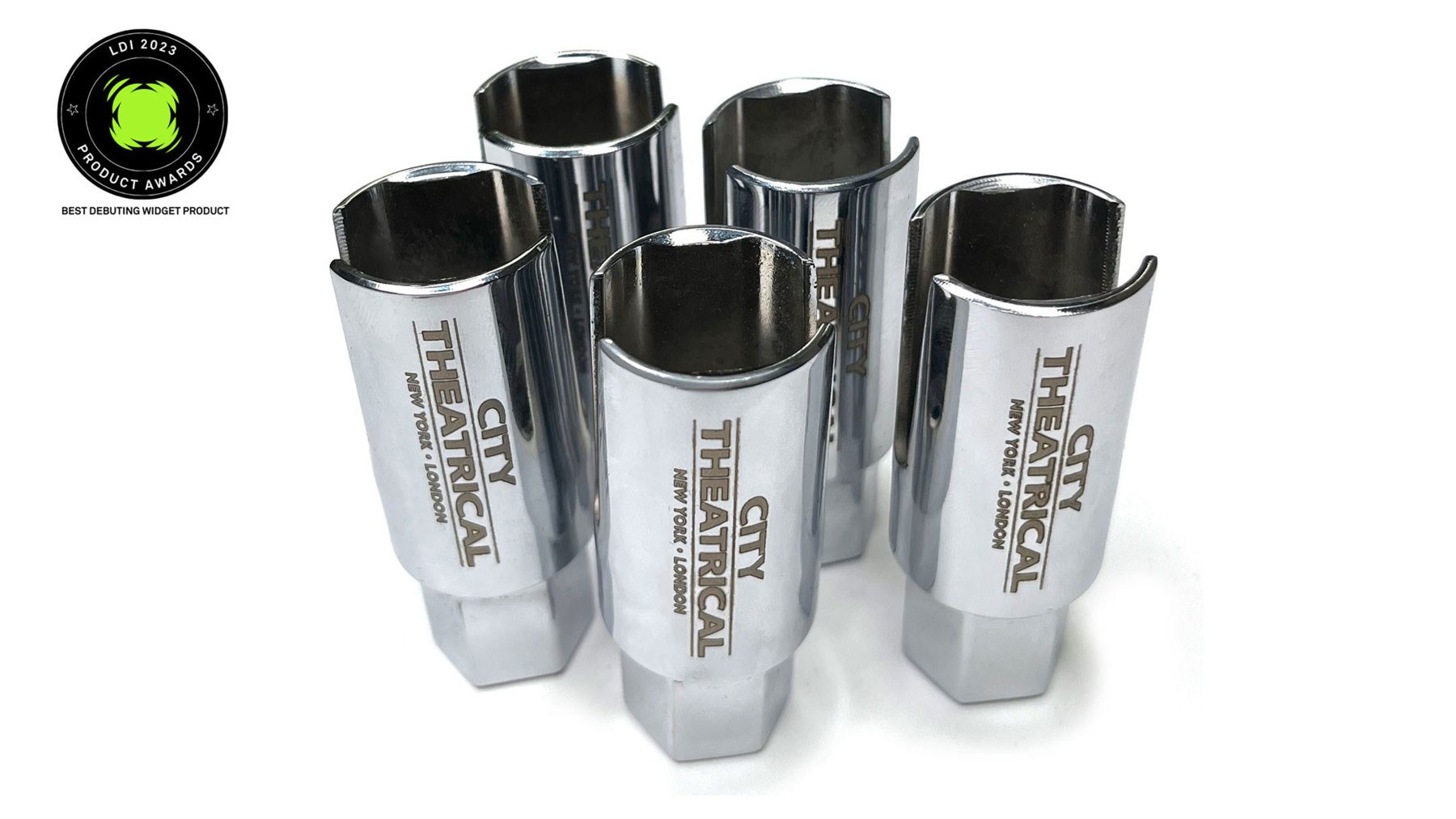 The Wing Nut Socket is a sleek and smartly designed chrome tool that is a designed for any lighting technician working with theatrical clamp wing nuts on a regular basis. It is made of steel for durability and chrome plated to help prevent rusting. City Theatrical’s Wing Nut Socket won the Best Debuting Product Award at LDI Show 2023 in the Widget category. This recognition comes as a result of its ability to make theatre electricians’ job easier and safer by making wing nuts easy to tighten while in the user’s hands.