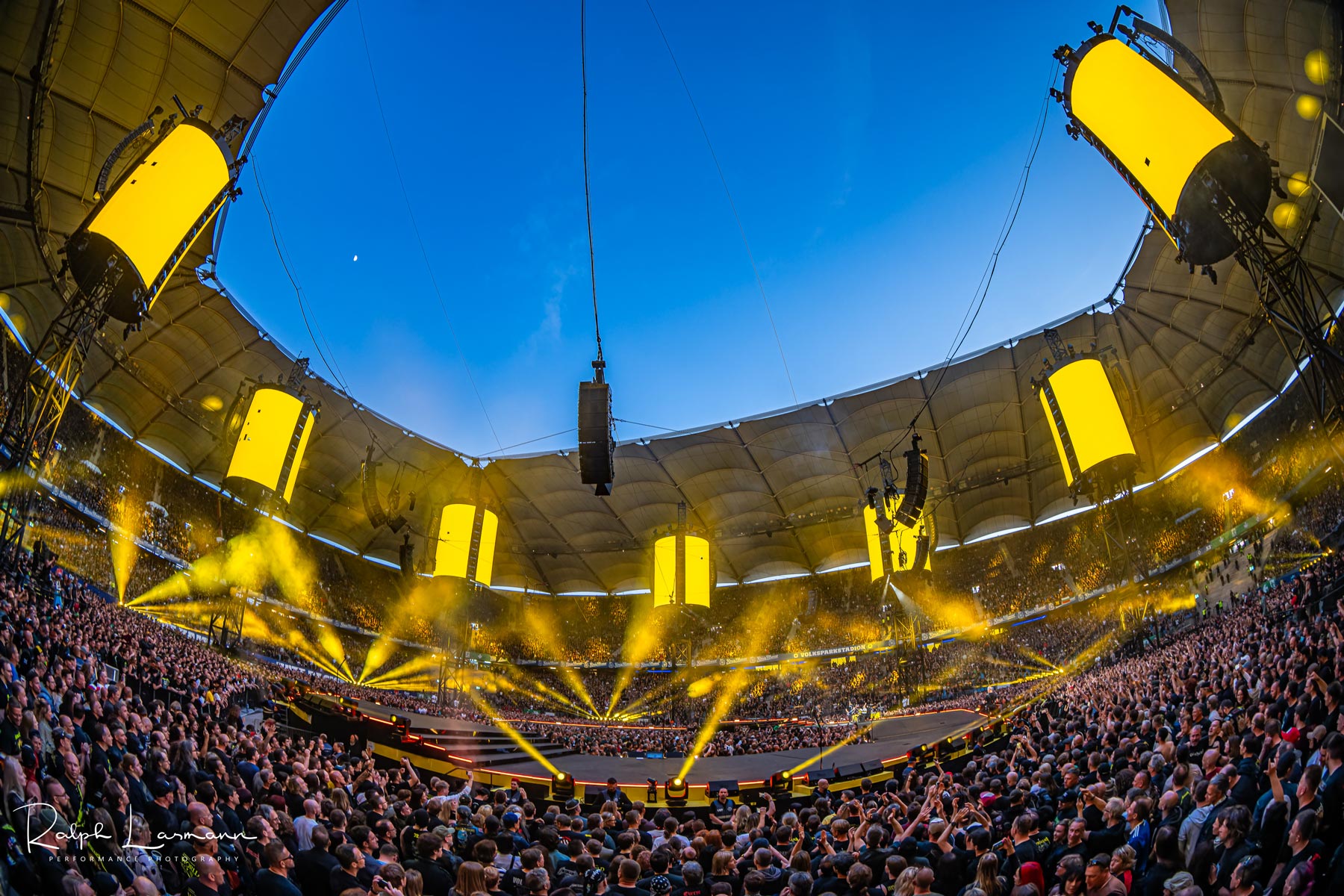 The tour maintains an upgraded in-the-round stage design by creative director/production designer Dan Braun, which relocates the coveted audience ‘snake pit’ to the centre of a ring-shaped stage surrounded by eight towers, each topped by LED video cylinders.