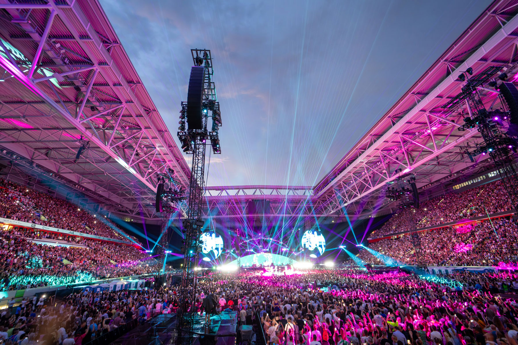 Routhier’s original tour design launched in 2022 in support of the Music of the Spheres album, and the band is continuing the current stadium tour with the same design. For this summer’s European leg, which launched on 8 June at the Olympic Stadium in Athens, she was looking for the most effective way to add a searchlight-type effect to the show without using a heavy, power-consuming fixture. “We wanted to add lighting to the seats to expand the overall image of the rig without adding a ton of structure,” she said.