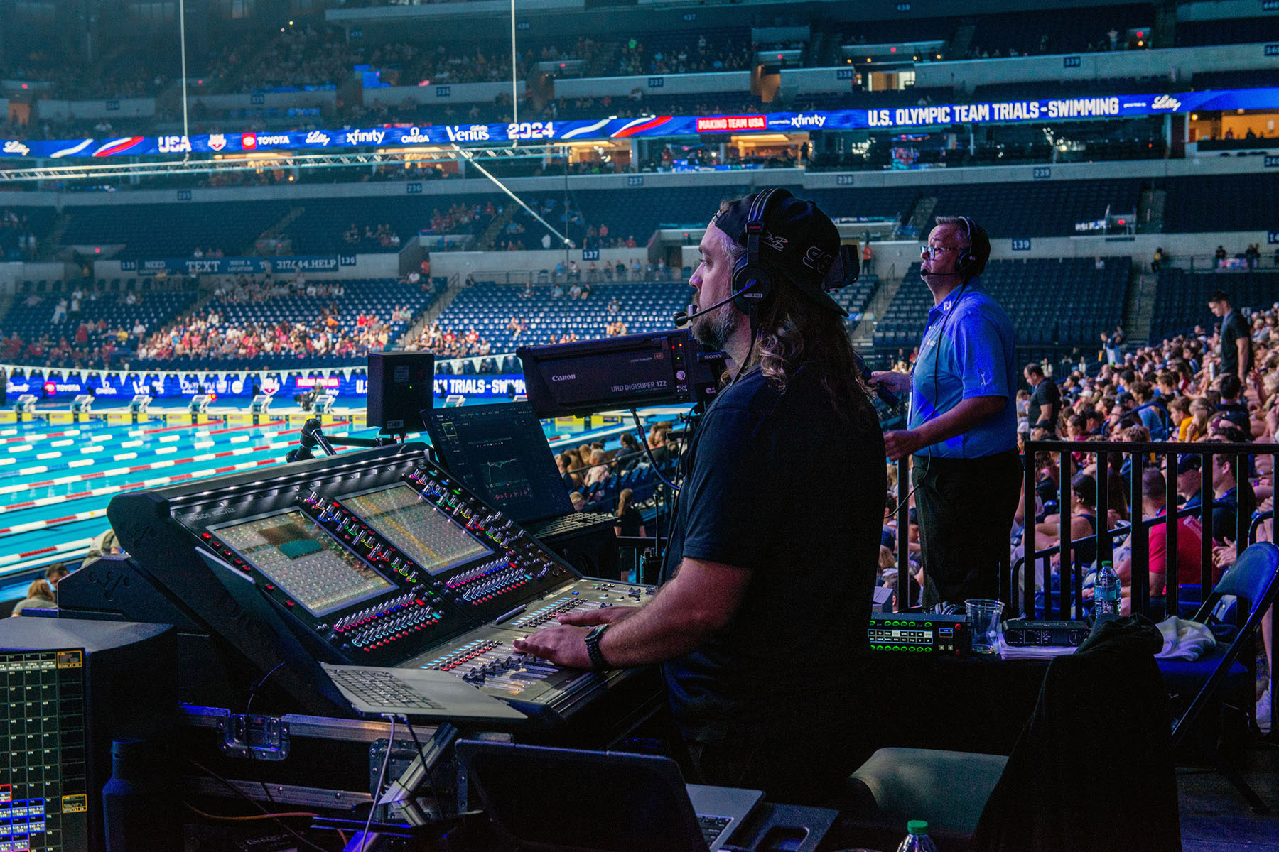 “It really is on a scale with an NFL Draft,” observes Caleb Cassler, senior audio specialist with Dodd Technologies (DTI), which provided the live sound for the Olympic Swimming Team Trials this year as well as many USA Swimming Events since 1996, including past Olympic trials. Dodd also provided a second SD12-96 and a DiGiCo SD10 plus an SD-Rack for USA Swimming LIVE!, an outdoor music stage that programmed DJs, bands, and presentations all week between trials sessions.