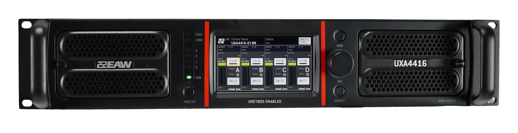 UXA4416 amplifier presets unify the performance of all supported EAW professional speakers and arrayed systems with four processed channels of audio amplification, complete with a dedicated Greybox preset library. A front panel addressable 4.3-inch display offers an easy touch screen or tactile encoder access to the EAW library and editing.