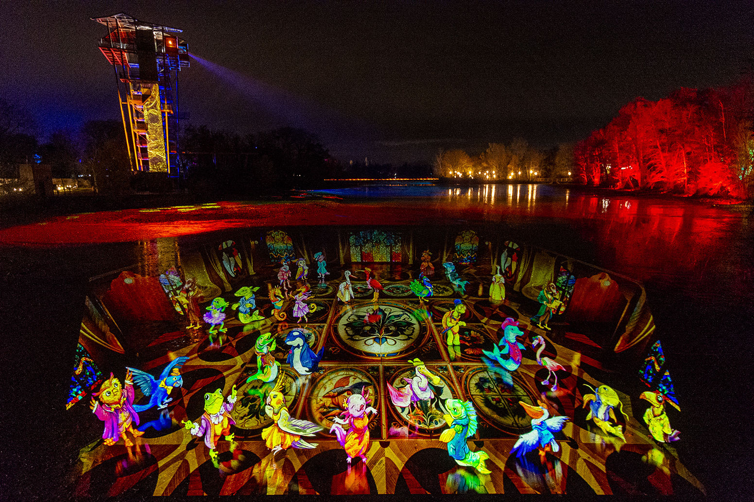 France - Three Groupe Novelty companies mobilised their respective technical expertise to deploy a night-time audiovisual immersive experience for the Parc des Oiseaux with a 17,000 m² projection onto a semi dried out lake.