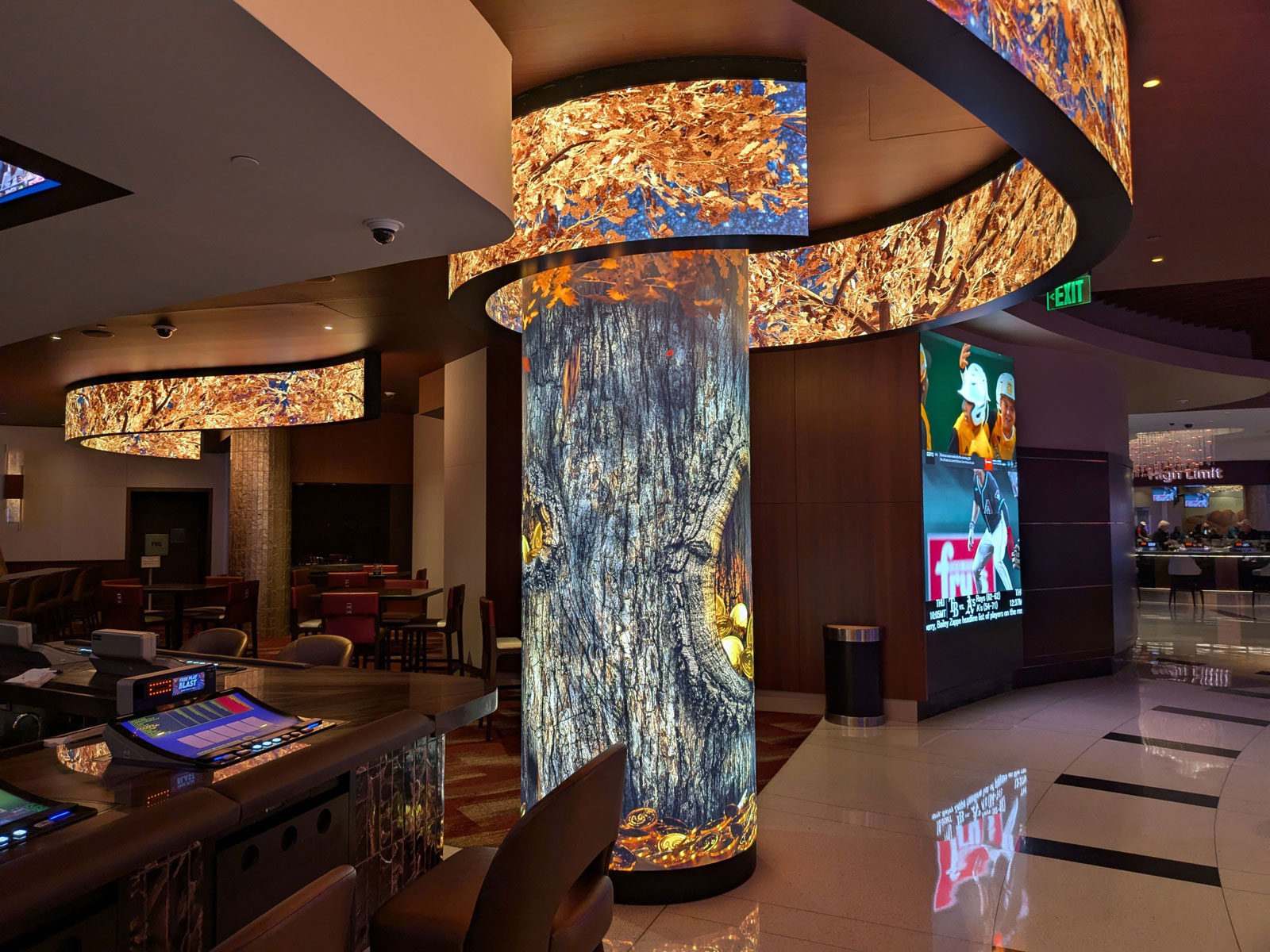 There are a series of DVLED walls throughout The Poker Room and The Showroom, that include three large 20’ x 16’ displays in a hallway, two column wraps that are 17’ x 7’, and a series of ribbon type displays that weave through the showroom and align on columns in The Poker Room. The displays range from .93MM to 1.67MM.
