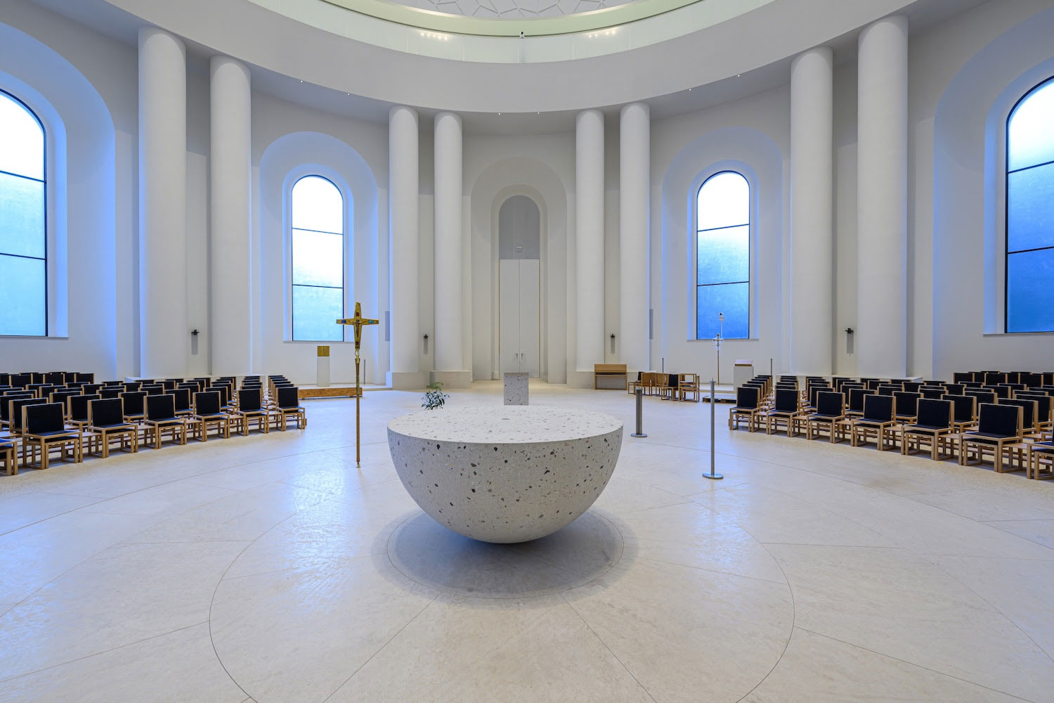 Circular in shape, with a 30m diameter, the central space rises to a dome that peaks at a total height of 33m. The huge parabolic space has renowned acoustics for music and is well-suited for performances from the Klais Opus organ. For spoken word, however, the reverb times negatively impact intelligibility and the echo bouncing back to the altar in the centre posed a considerable challenge.