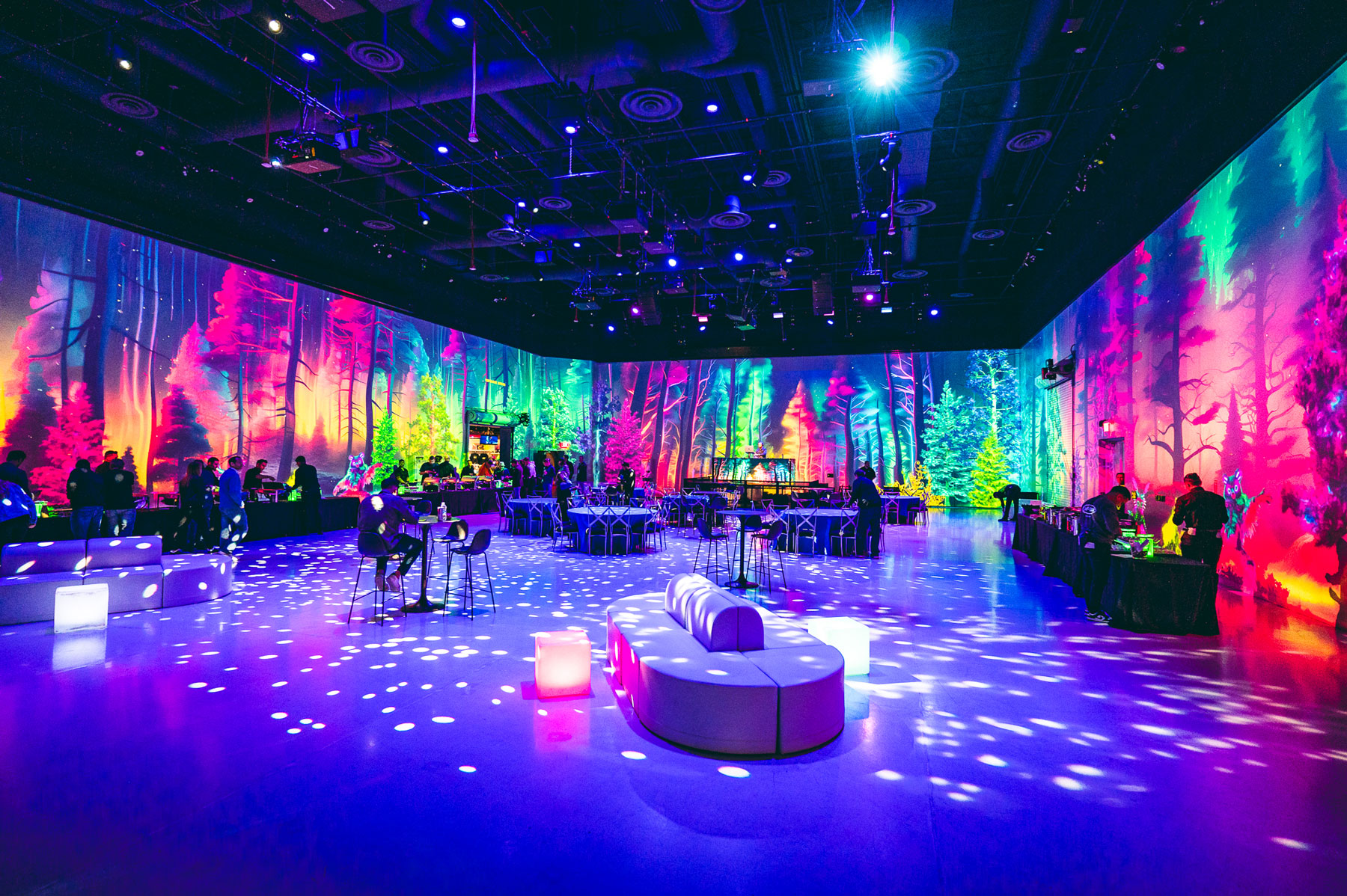 The Portal is Area15’s landmark venue. It can be used for private dining, all-night DJ sets, and everything in between. At Halloween, for example, the Rocky Horror Picture Show is projection-mapped on all four walls of the venue and supported by live actors, but it has also been home to fine art shows and corporate events.