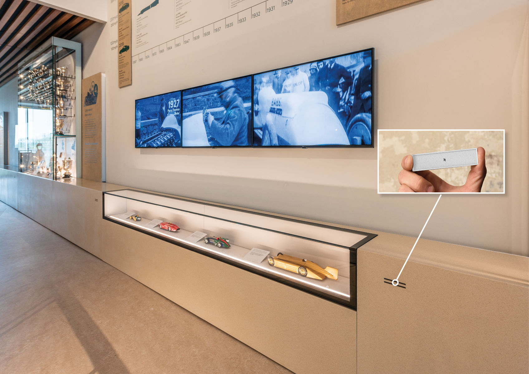 DJW’s solution was to locate the ultra-micro Lyzard-KZ14 line arrays behind the fascias of the exhibits, so that it’s not immediately obvious exactly where the sounds that accompany the footage of the feats of John Parry-Thomas and his contemporaries are actually coming from – the only clue as to their location being the pair of subtle horizontal slots machined out of the continuous Corian exhibit housings.