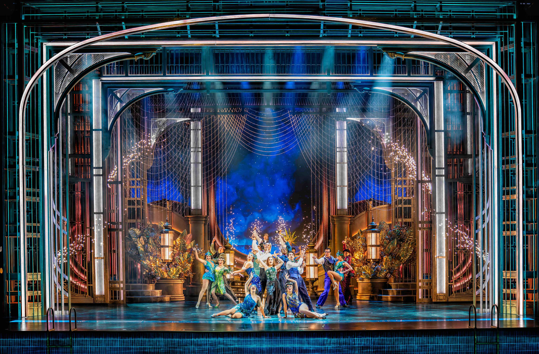 “On top of this we play with a lot of teals, blues and greens amid many references to the Bay (the other side of which lives Gatsby’s unattainable object of love, Daisy Buchanan) and the swimming pool (the cold light of which emanates up from the orchestra pit) which plays a critical role in the story. We augment this with lots of refractions and reflections.