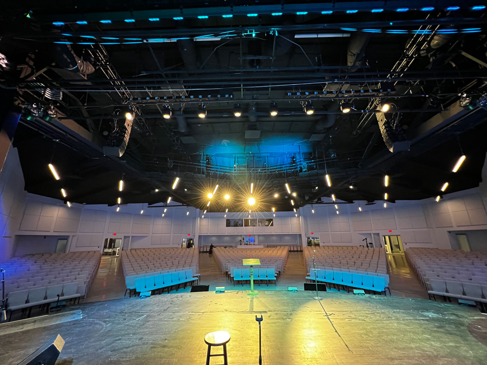 The main gathering space at RHCC is a fan-shaped auditorium which seats around 950 people, with a 40ft wide stage approximately 70ft from the rear seats. The modified layout of the space demanded that a system not only deliver premium sound and full coverage, but that it was lightweight enough to not overburden the room’s ceiling support structures.
