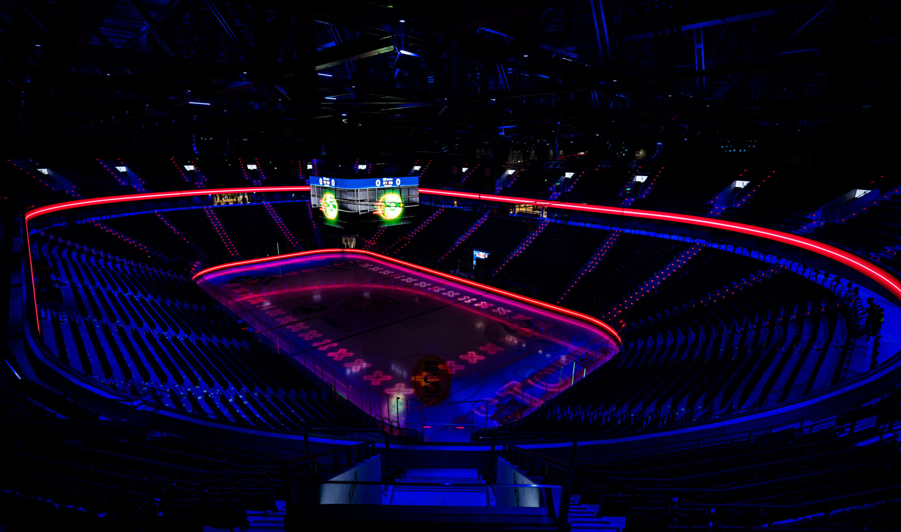 An impact-responsive LED ring that displays commercials around the outside of the ice rink or basketball court responds dynamically to wall impacts during the game, with adverts wobbling and warping when touched. Finally, player and puck or ball tracking leverages gameplay data to trigger various animations and effects during match break games, completely transforming traditionally held ideas of what to expect from a live sports experience.