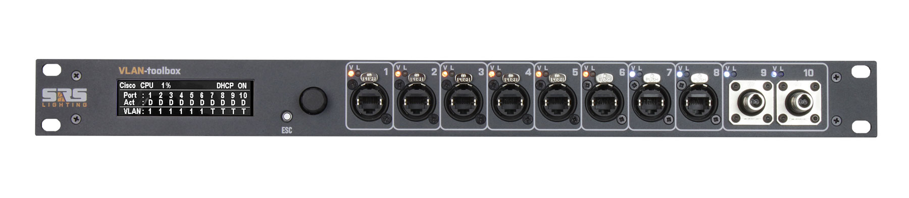 The SRS Lighting VLAN-toolbox is a solution for managing AV networks during events and in theatres. The device provides users with an easy way to segment networks, optimize data speeds, and separate different data streams (such as audio, video, and lighting control). This results in a clear network structure and reliable performance, even in the most demanding environments.