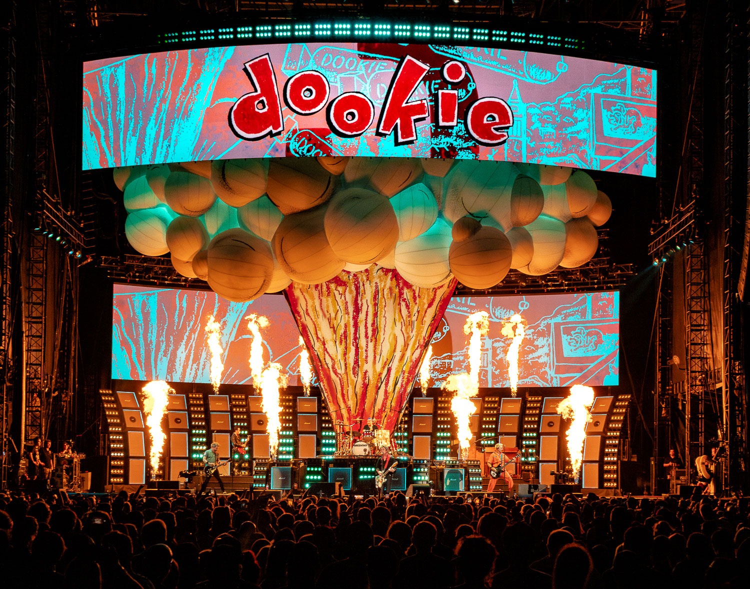 “We crafted a set design around the Tambora Flash and its ability to mould into what looks like an audio line array,” says Routhier. “The main inspiration was a combination of sound and light to highlight the band’s high-energy stage presence. Using dummy cabinets and arc arrays of the Tambora Flashes, we built a set that curves slightly inward and back as if it is exploding from the stage. The shape accentuates the large inflatables that we had crafted for Dookie and American Idiot.”