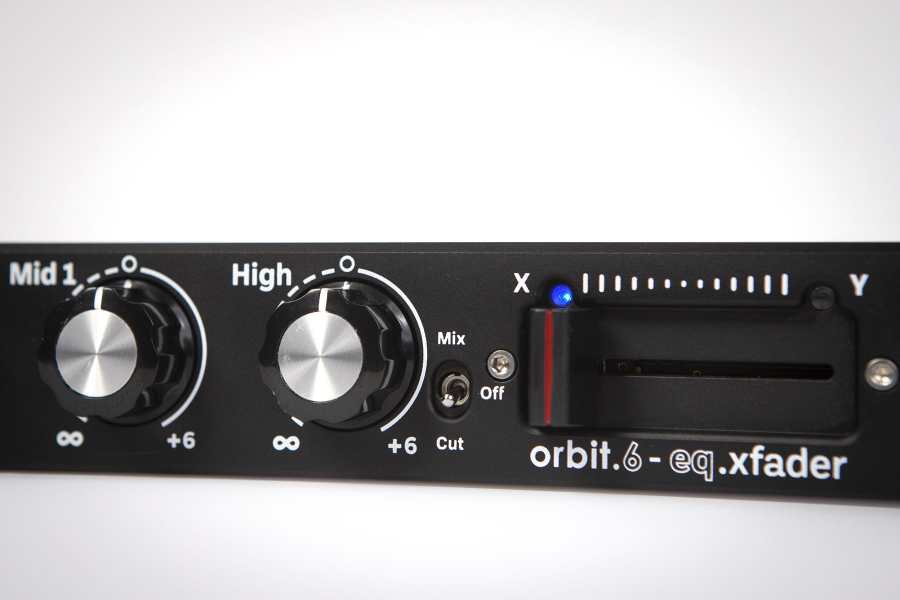 Designed with a six-channel architecture to mirror the orbit mixer, the dual crossfader transitions between audio sources connected to either side of the crossfader, placing channels 1-3 and channels 4-6 on opposing sides of the crossfader. A Mix/Cut switch alters the crossfader's functionality from a carefully designed curve to create gradual transitions in Mix mode, to full volume in Cut mode when the crossfader is moved towards the end-stop.